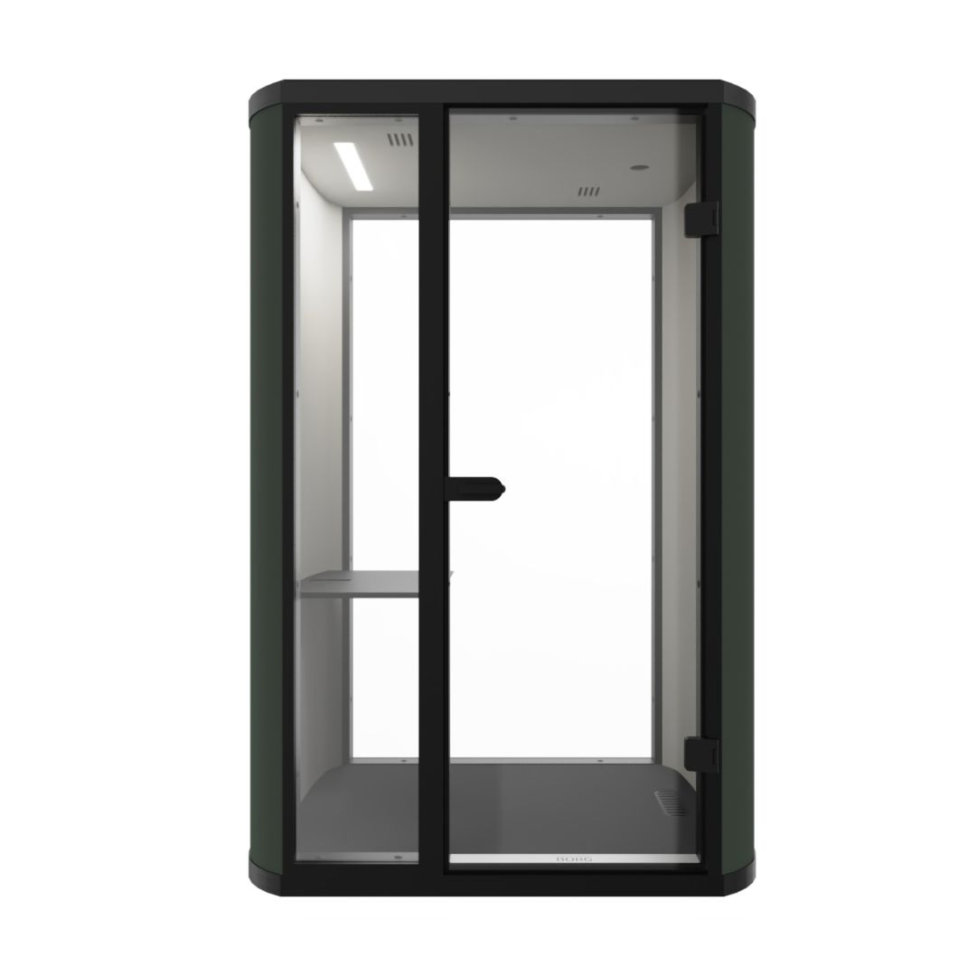 De eCell+ biedt een oase van rust en privacy dankzij de geluidsisolerende dubbele wanden, gestoffeerd met akoestisch vilt aan de binnen- en buitenkant. Deze hybride werkplek heeft een indrukwekkende geluidsreductie van 35 dB, waarbij het glas met een akoestische absorptiewaarde bijdraagt. Dit komt door het dempende membraam tussen de dubbele laag glas. Het resultaat? Geen externe kantoorprikkels en een privételefoongesprek. De gestoffeerde binnenzijde is standaard uitgevoerd in een licht of donkergrijs vilt.